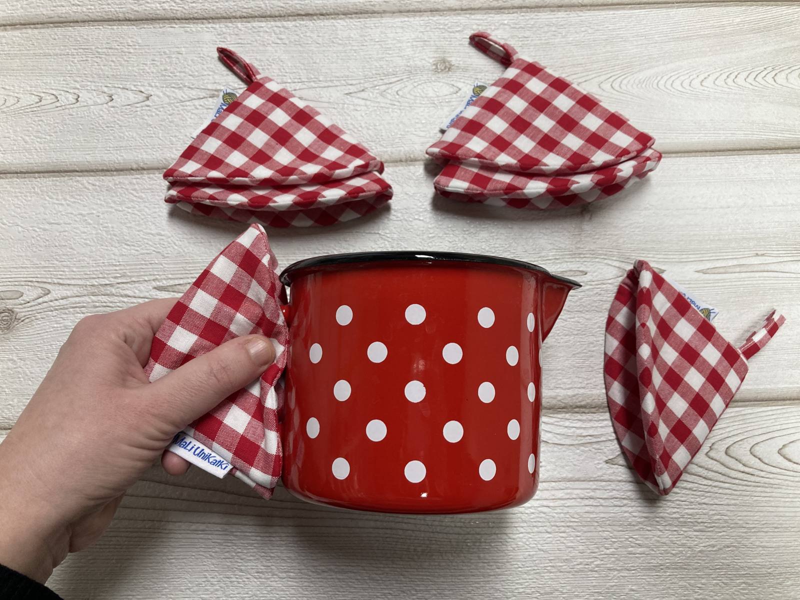 Set dveh kuhinjskih prijemalk, ki sta odporni na visoko vročino in je namenjeno za prenašanje posode ali dvigovanje pokrovke. Tako bodo vaše roke zaščitene. Vsaka ima še trakec za obešanje in tako so lahko vedno pri roki.