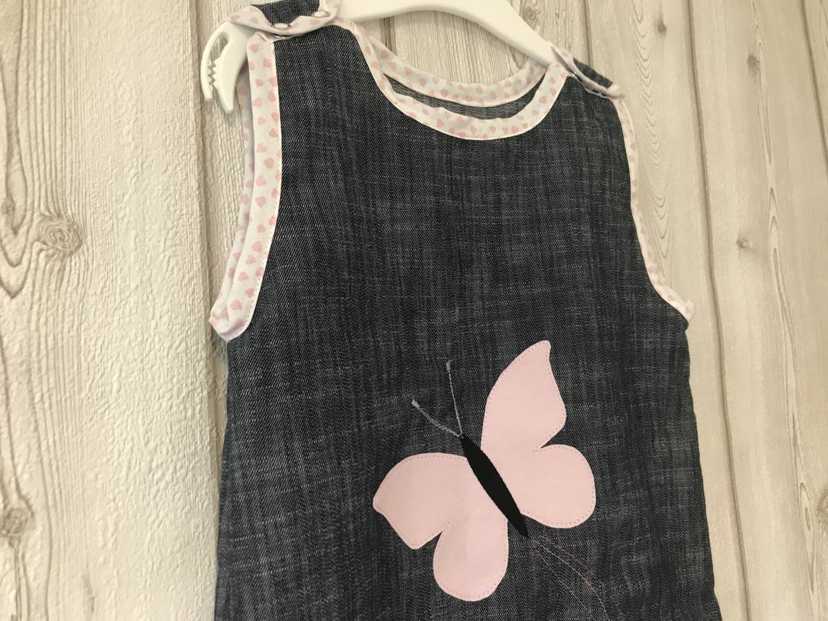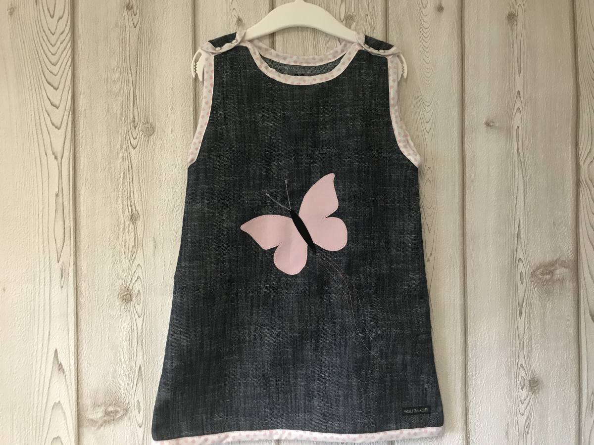 Oblekica je narejena iz mehkega in udobnega jeanska z aplikacijo. Na ramenih ima pritiskača za lažje oblačenje. Se zelo dolgo časa nosi in je potem lahko tudi kot tunika ali majčka. Oblekca je unikat in se lahko naročiti tudi v drugih velikostih, barvah in motivih. Kontaktirajte nas na meil info@maliunikatki.si.