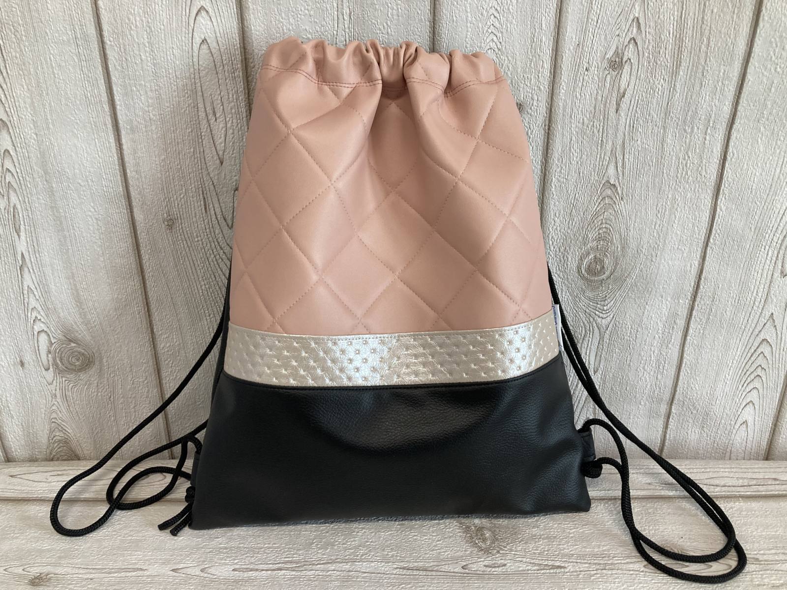 Modni nahrbtnik je narejen iz umetnega usnja, velikosti cca. 40 X 34,5 cm. Notri je podložen z bombažem iz z žepkom na zadrgo.